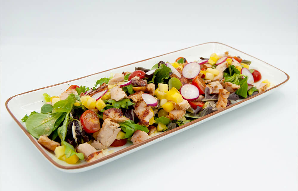 Mezcla de lechugas, Pollo asado, mango, tomate cherry y cebolla