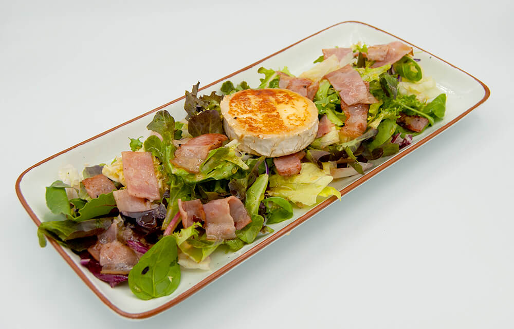 Mezcla de lechugas, queso de cabra caliente, bacon y vinagreta de miel