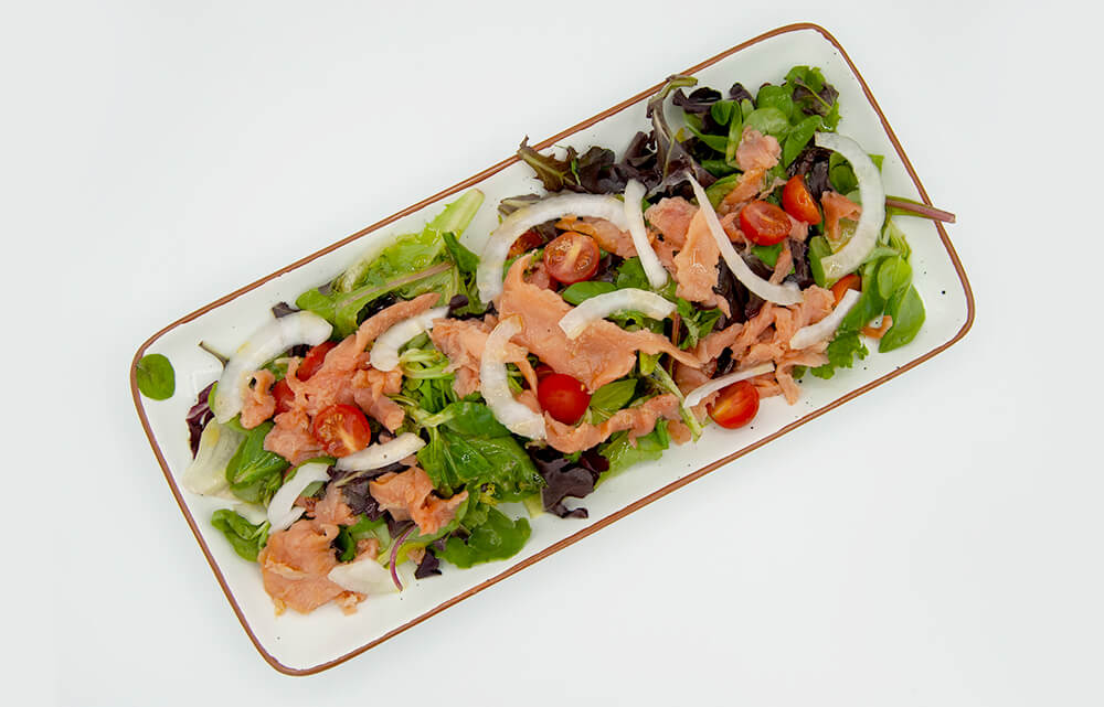 Mezcla de lechugas, salmón ahumado, tomate cherry y cebolla